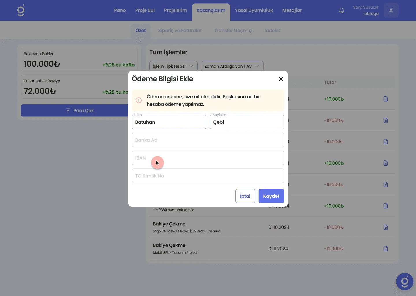 Yurt dışı IBAN kullanımı → Şu an sadece Türkiye içi banka hesaplarına ödeme yapılabilmektedir
