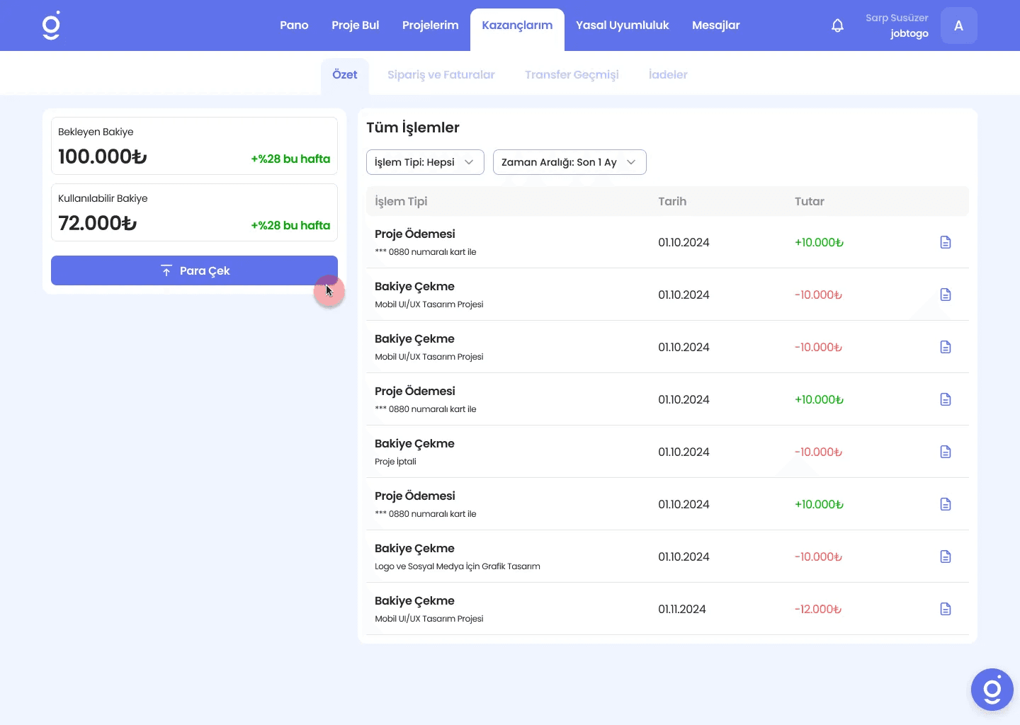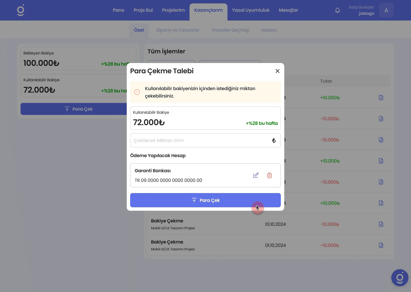 Jobtogo’da proje ödemeleri, işverenin projeyi tamamlandı olarak işaretlemesinin ardından hesabınızdaki bakiyeye yansır. Bu aşamadan sonra, istediğiniz zaman para çekme talebi oluşturabilirsiniz.