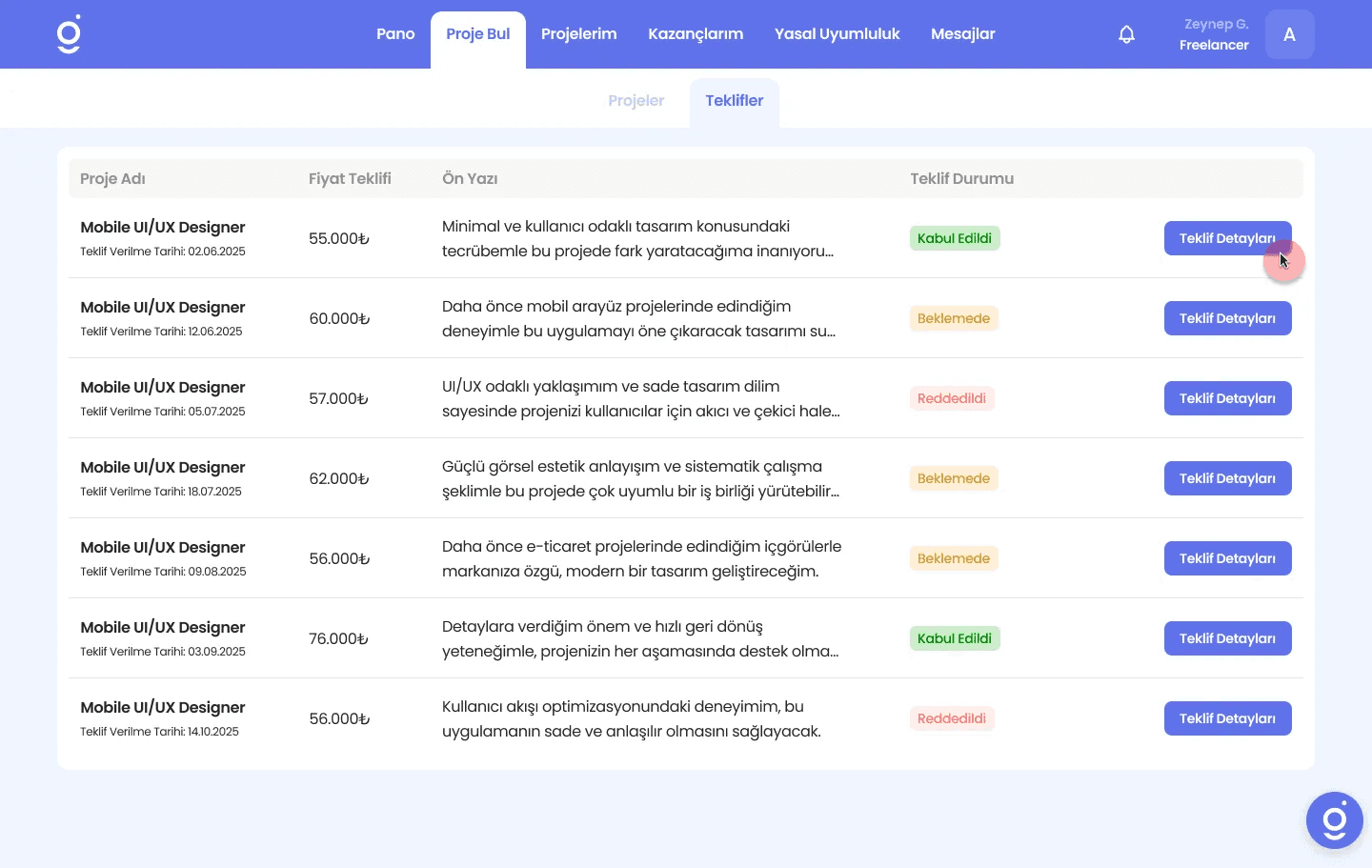 Açılan ekranda, daha önce teklif verdiğiniz projeleri görmek için “Teklifler” sekmesine geçiş yapın.