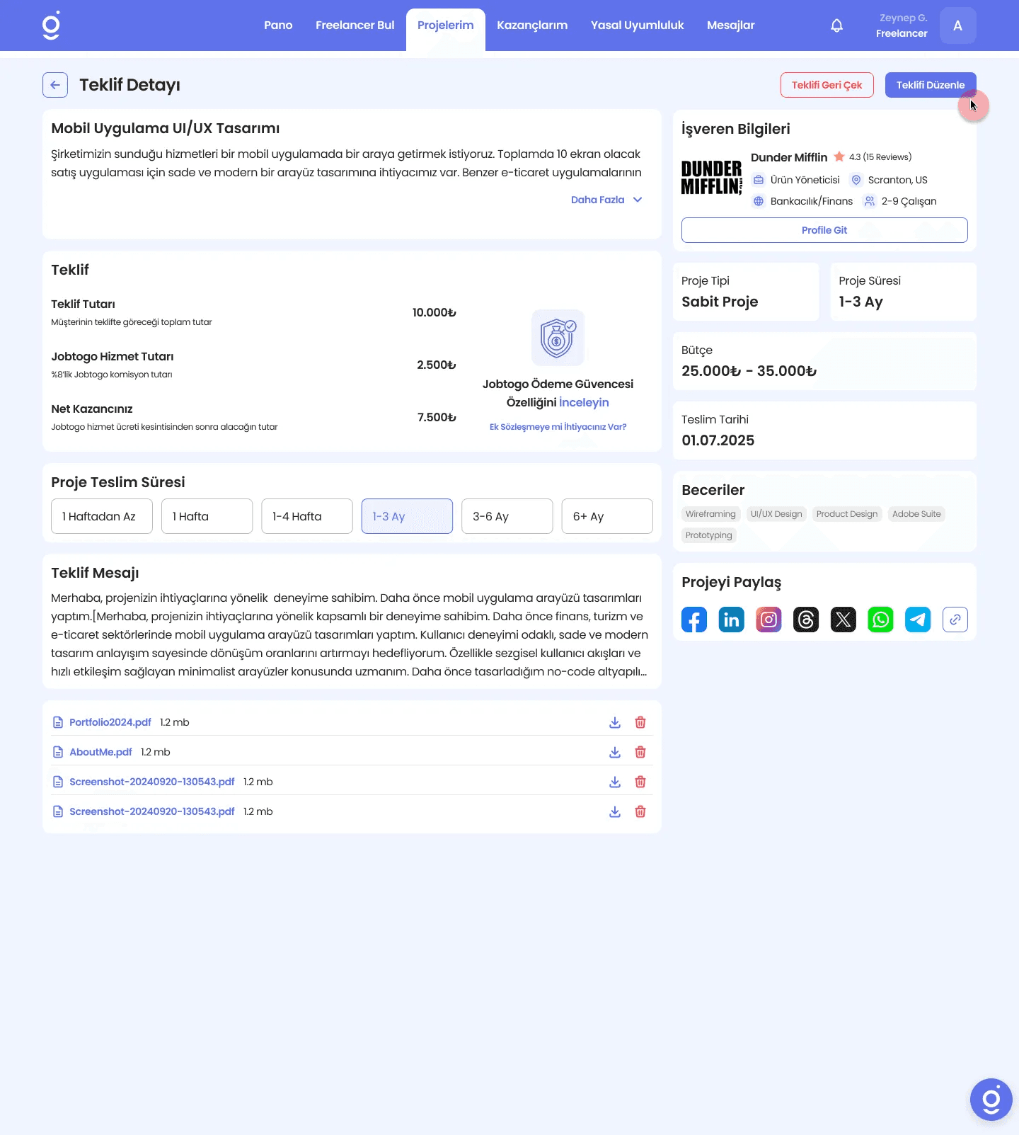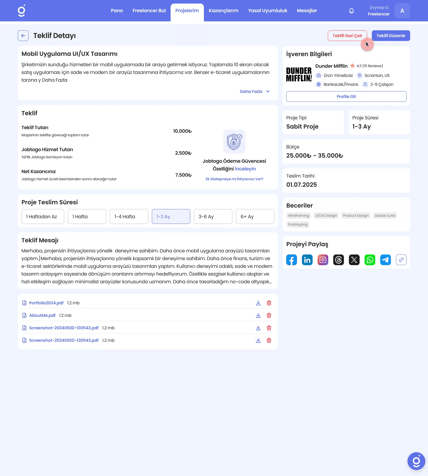 Not: Teklif düzenleme veya teklifi geri çekme işlemleri sadece süresi dolmamış projeler için gerçekleştirilebilmektedir.