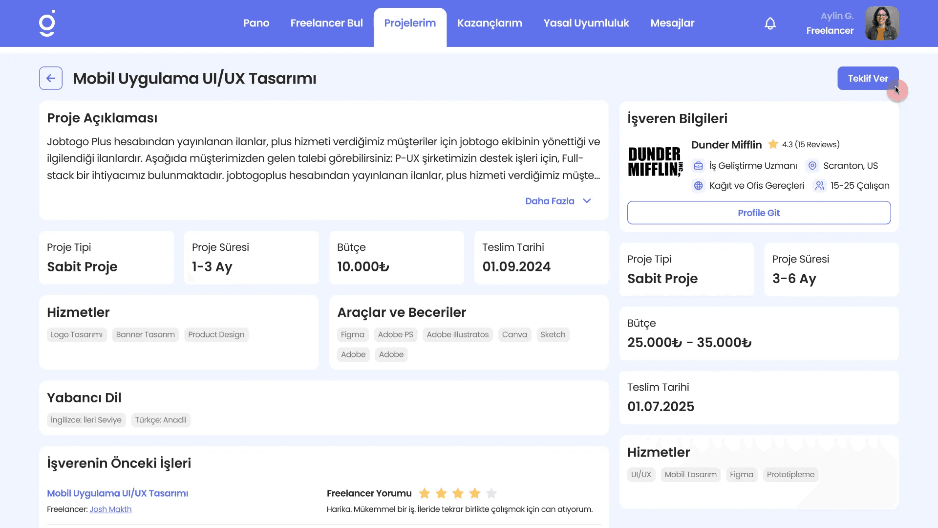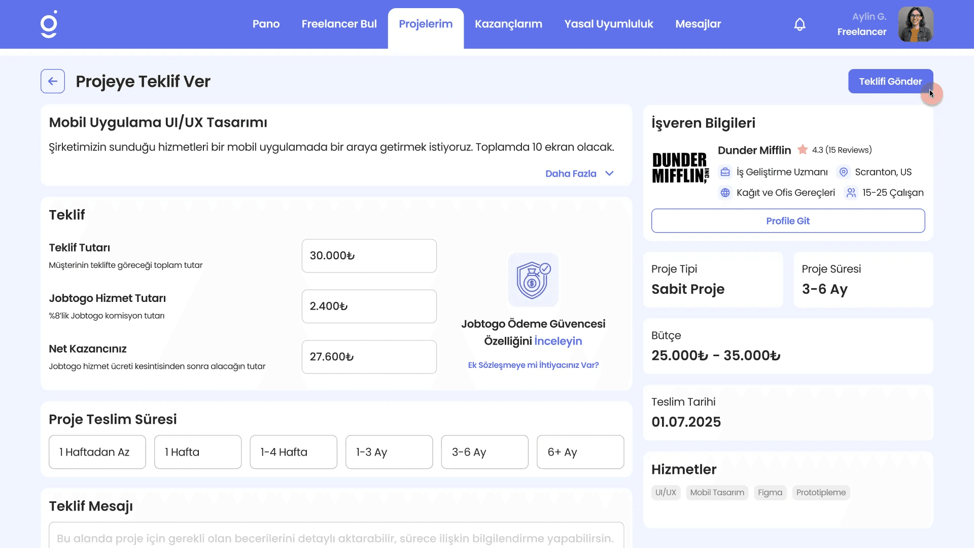 Proje’ye Git butonuna tıkladıktan sonra ilgili projenin içeriğini inceleyebilirsiniz. Bu alanda Proje tipi, proje süresi, proje bütçesi, istenilen proje teslim tarihi, proje açıklaması ve işveren bilgilerini görebilirsiniz.