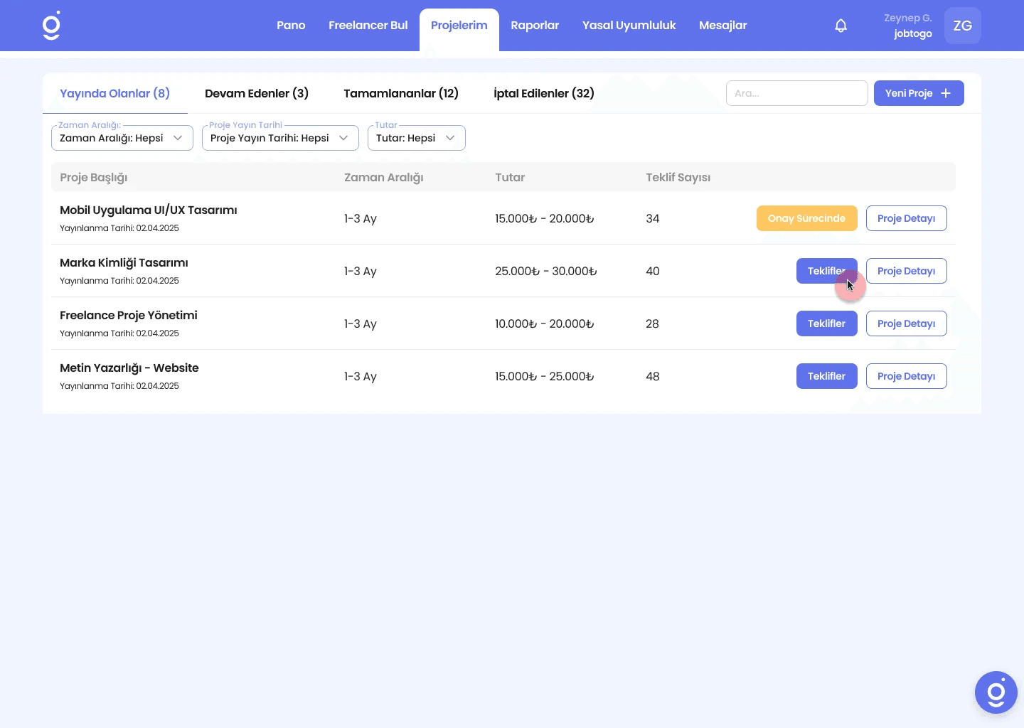 İlgili projenin yanında bulunan “Teklifler” butonuna tıklayarak proje için gelen tüm teklifleri görüntületebilirsiniz.