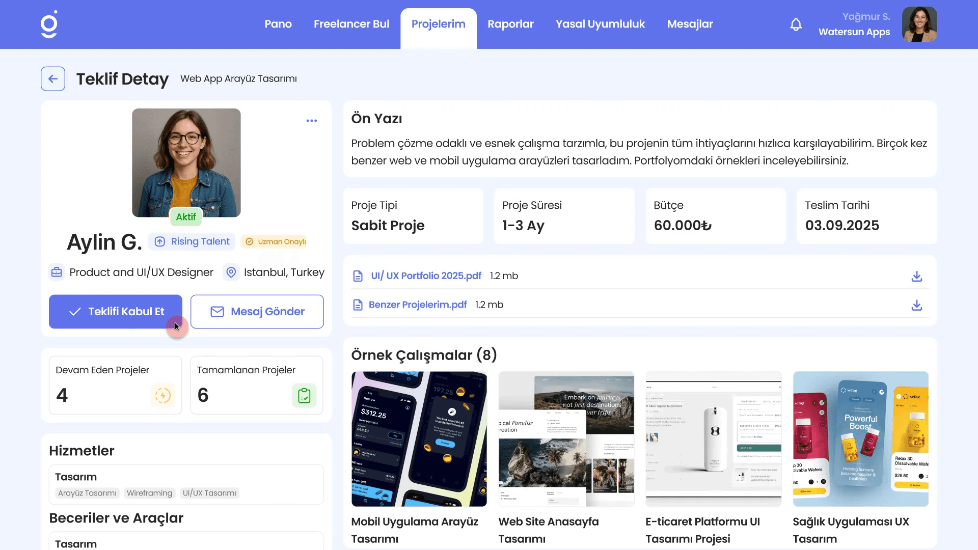 Burada freelancerın ön yazısını, projenin tamamlanması için belirlediği süreyi, teklifini, profil detaylarını ve varsa eklediği dosya/görselleri görüntüleyebilirsiniz.