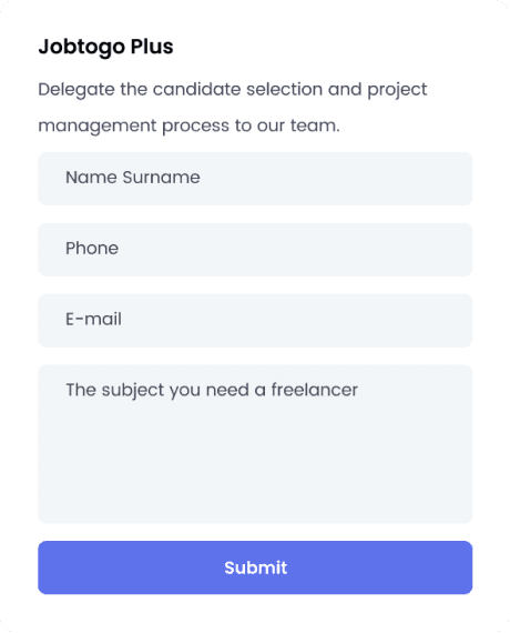 On Jobtogo, companies creating projects are quickly matched with expert freelancers in their field, addressing their resource needs. Companies can choose to work on a contract basis with freelancers if they wish. They can carry out tasks such as posting projects, evaluating proposals and candidates, contractual employment, invoicing, and making payments through a single panel. Companies that do not have time to select candidates and manage projects can delegate their processes to the Jobtogo team for only receiving the final output of their projects with Jobtogo Plus service.